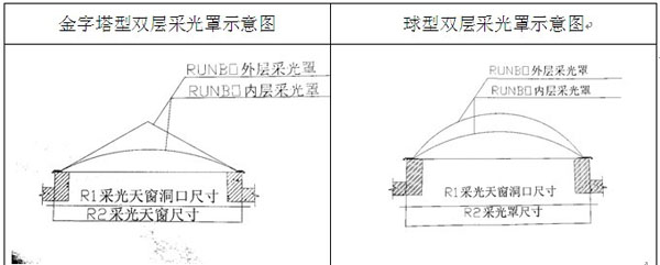 1 .天窗采光罩部分分為單層和雙層,單層采光罩厚度一般為4.5毫米,雙層采光罩厚度一般為3+4.5毫米。罩體形狀為球型或金字塔形狀,下口部位可制作成長方形﹑正方形﹑圓形﹑三角形﹑梯形等形狀。